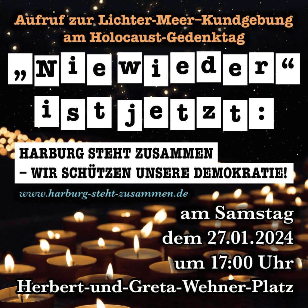 Die Gelegenheit gibt es zur Kundgebung ‚Nie wieder ist jetzt!‘ in Harburg am Samstag, den 27.1.2024 ab 17.00 Uhr auf dem Herbert-und-Greta-Wehner-Platz.